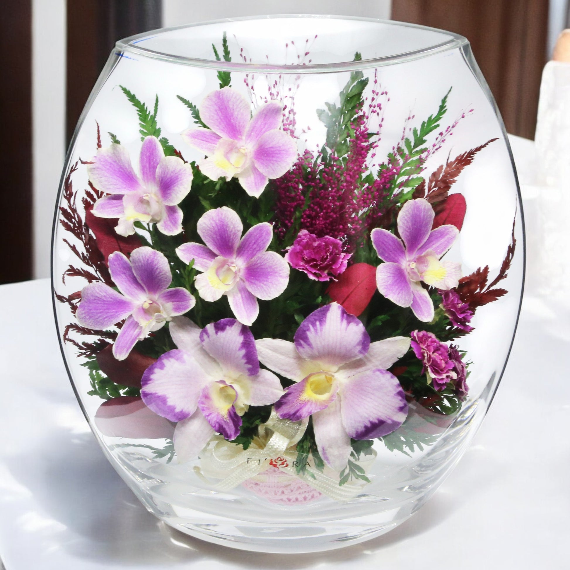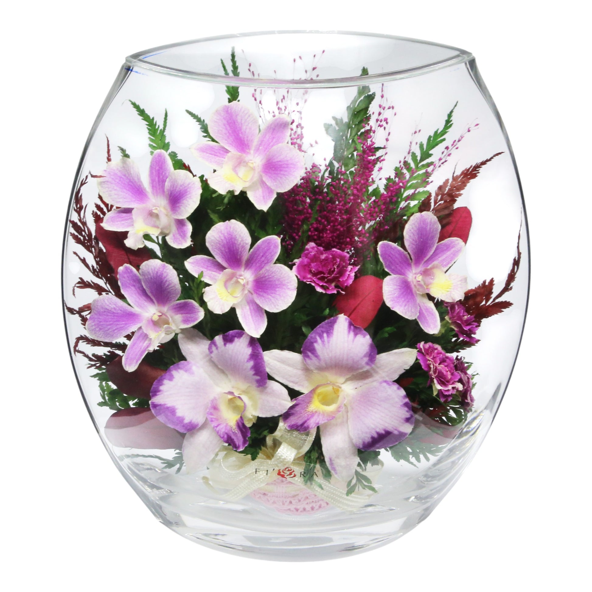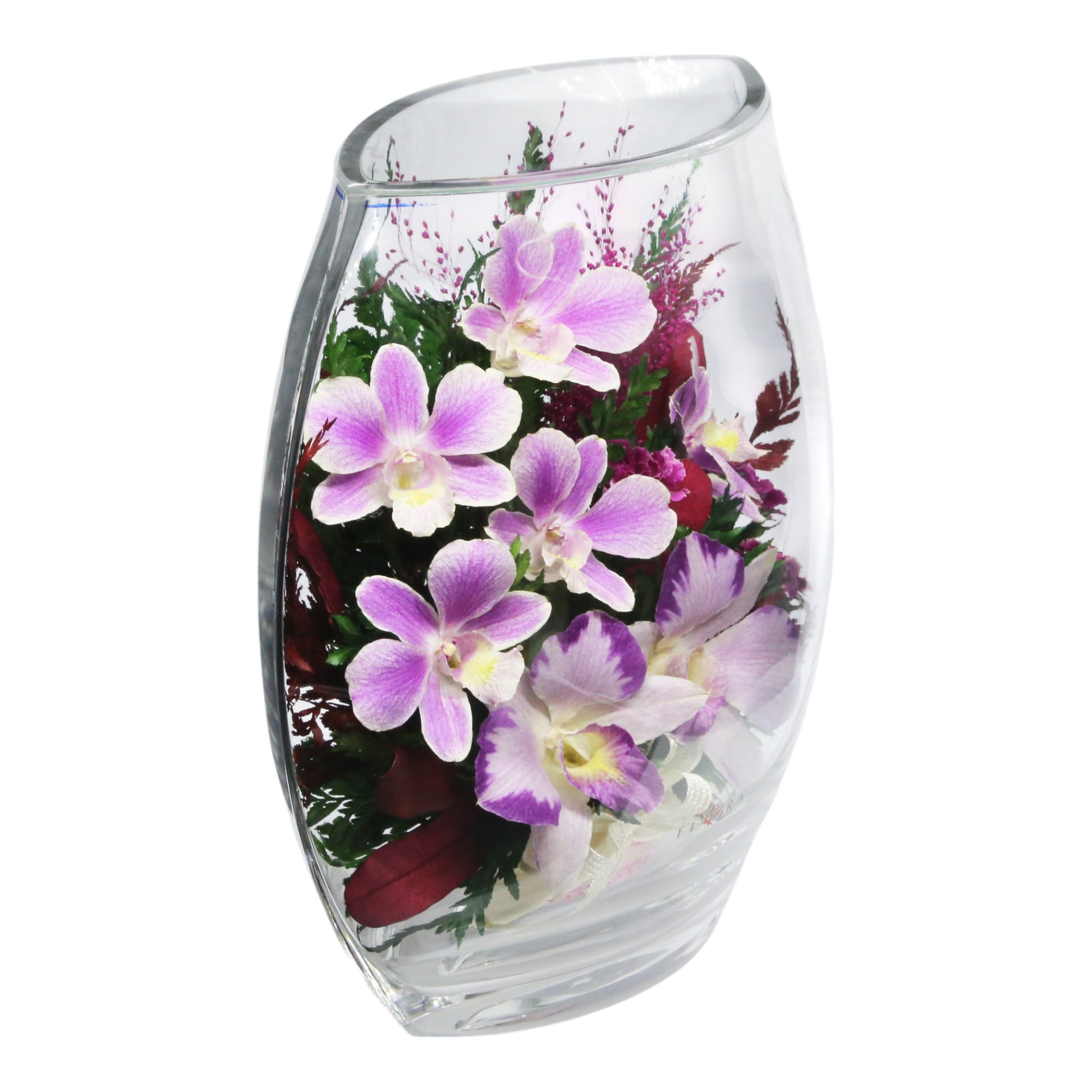 Elegant Purple Orchids in Rugby Glass Vase with Greenery