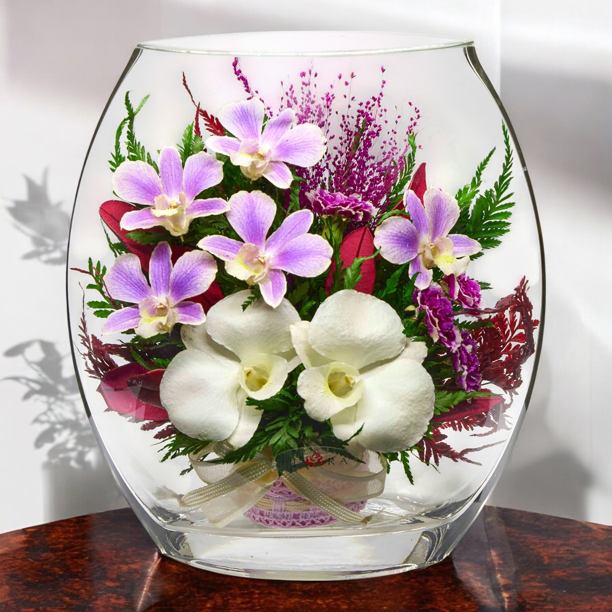 This elegant floral arrangement features a captivating mix of 2 white orchids, 5 purple orchids, and delicate spray carnations, all complemented by lush greenery. Encased in a Flat Rugby Glass Vase, it adds timeless beauty to any setting.