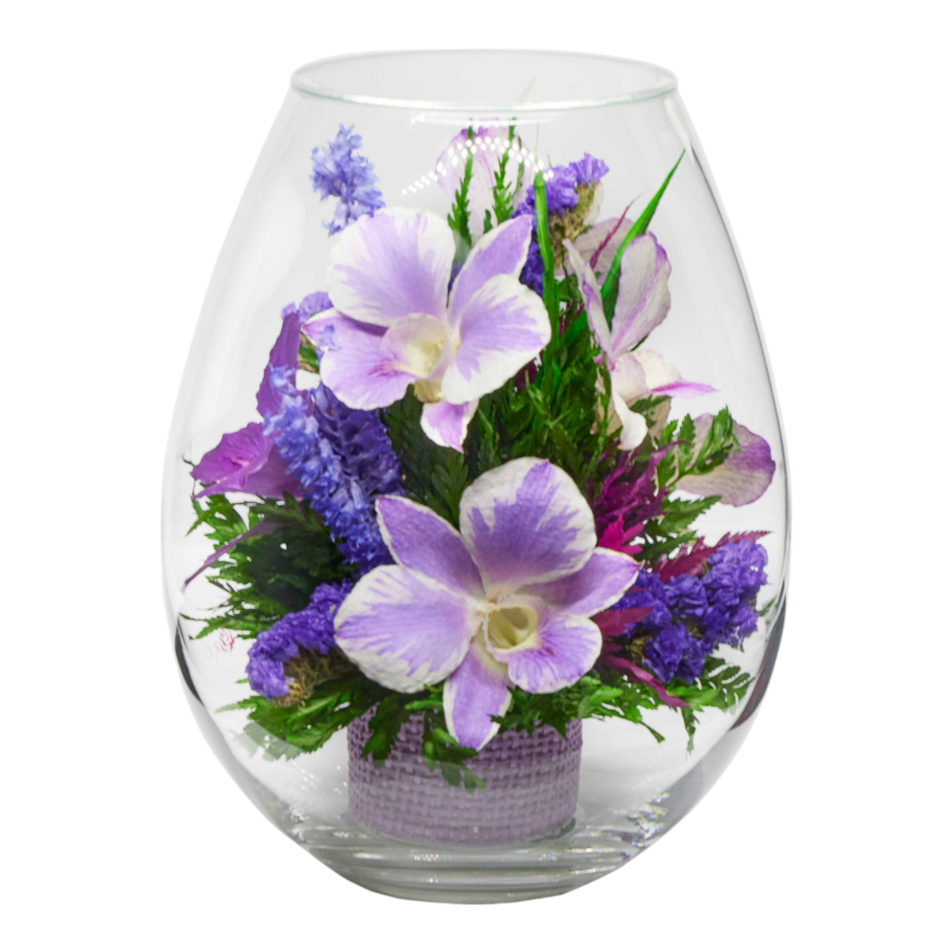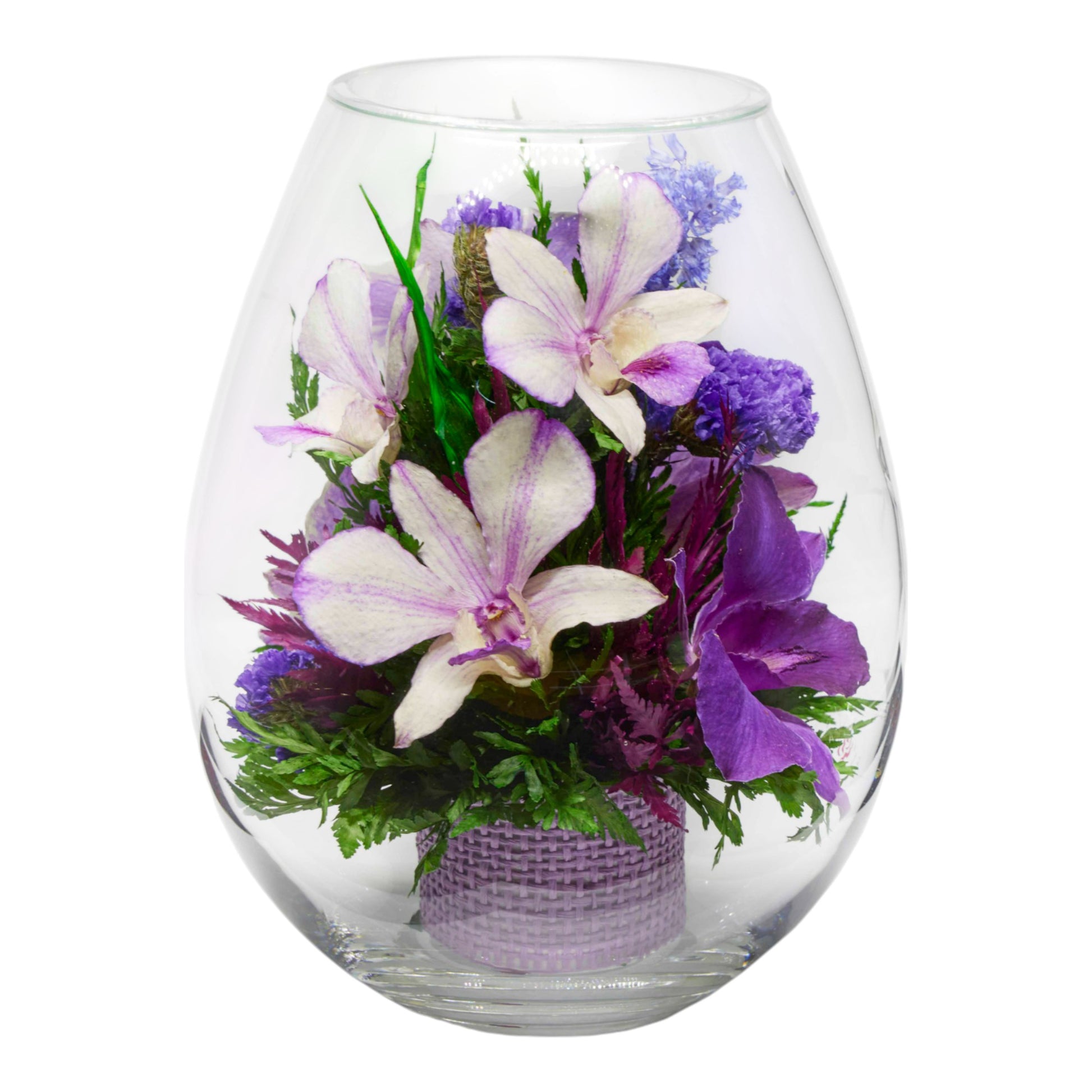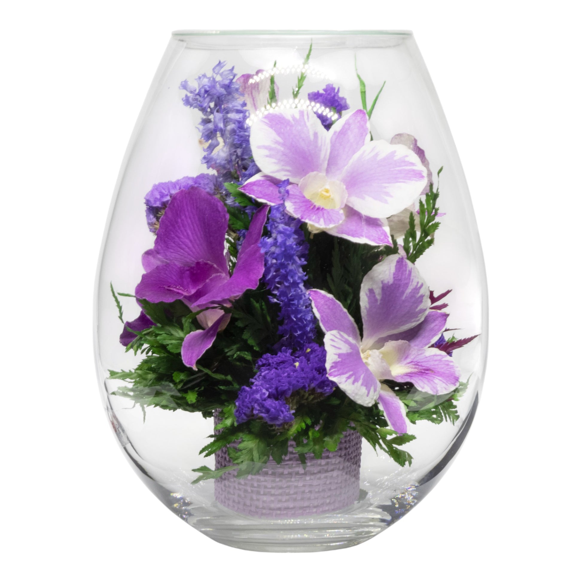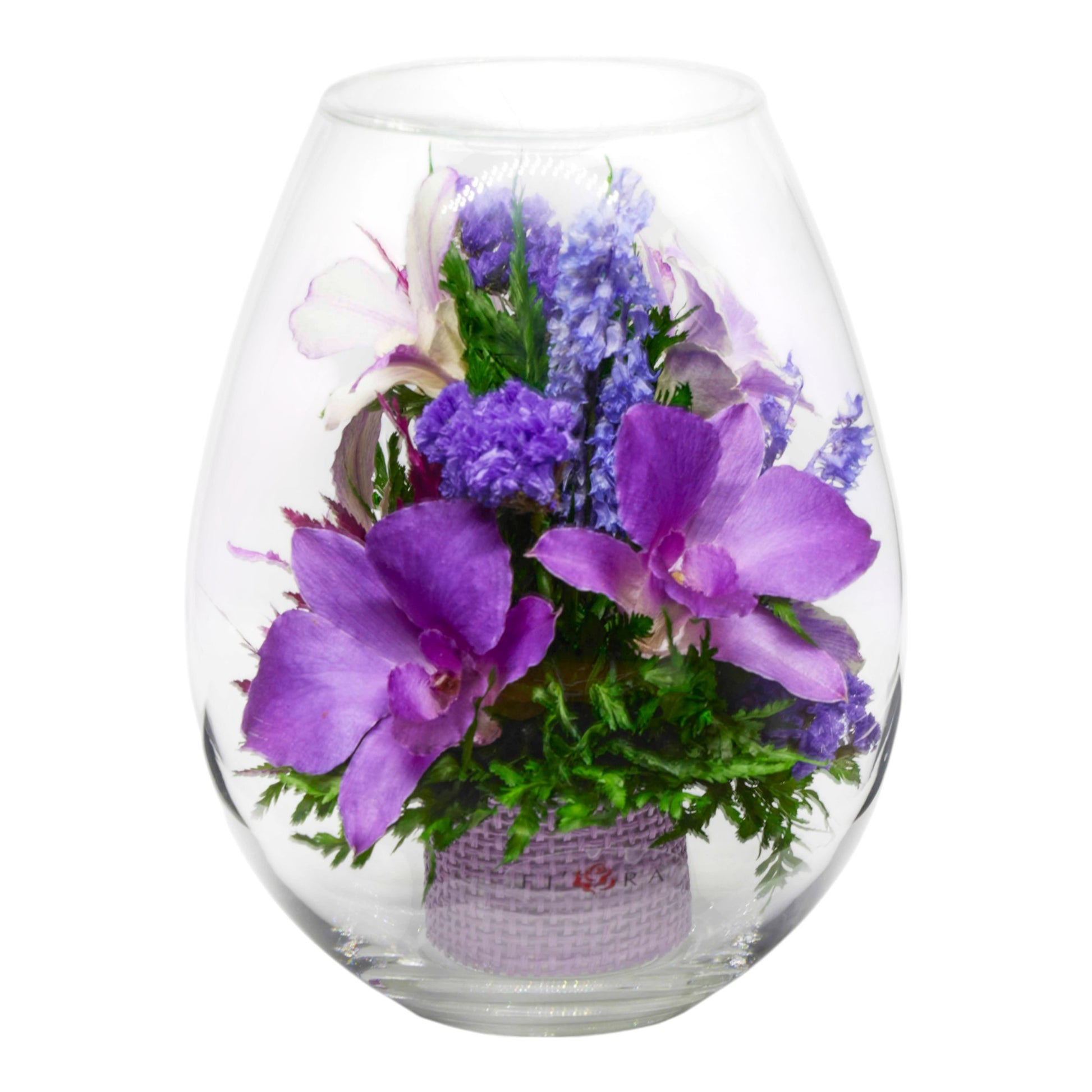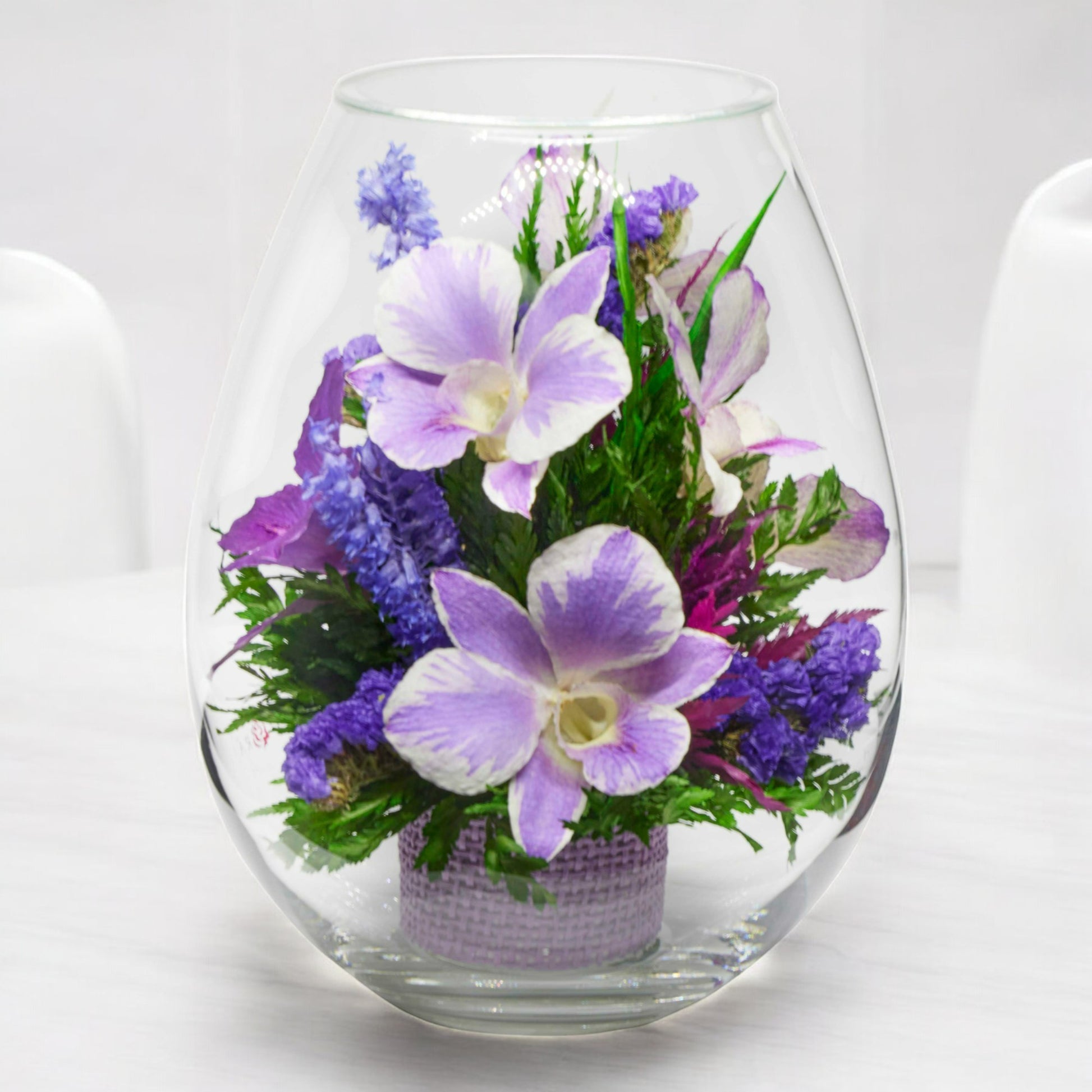 This elegant arrangement features a captivating blend of 2 Madam orchids, 2 Queen Pink orchids, and 3 Popeye orchids, paired with lush greenery. Displayed in a sleek Droplet Glass Vase, it adds a touch of timeless beauty to any space.