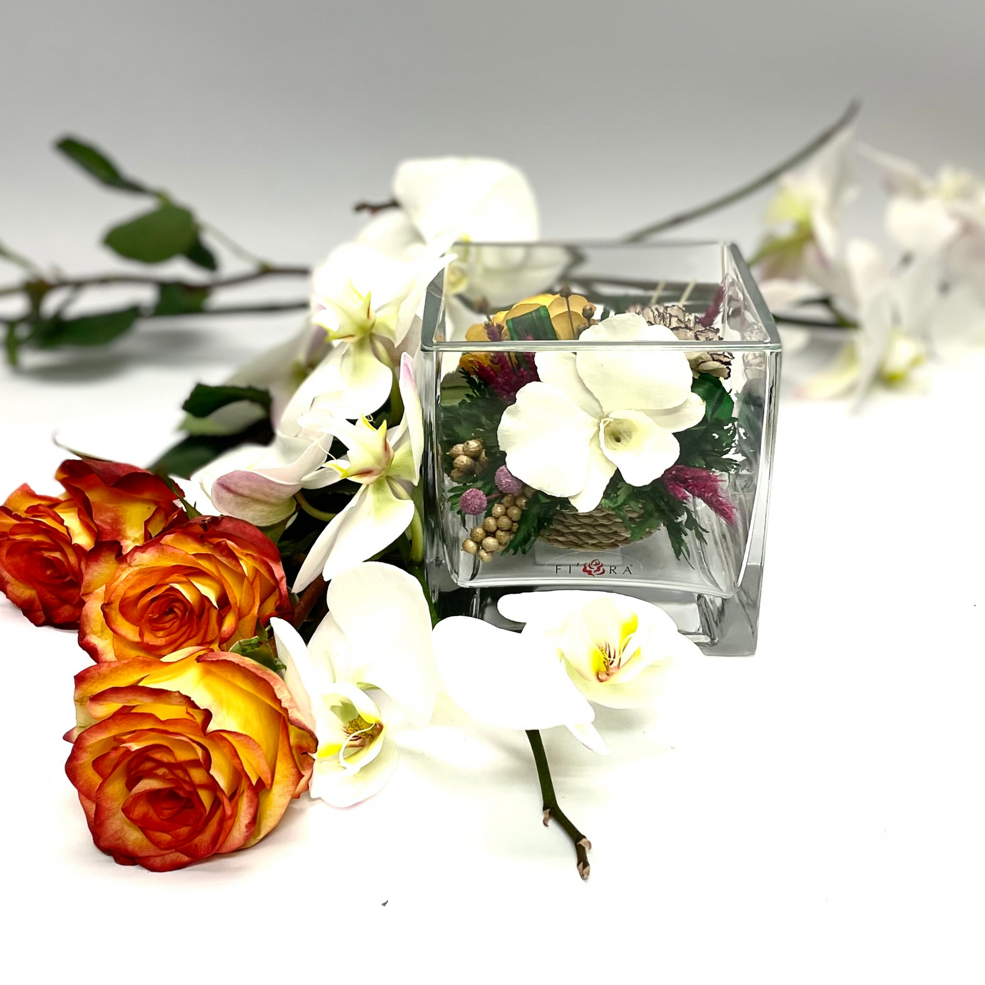 71881 Long-Lasting Yellow Rose and White Orchid in a Cube Glass Vase