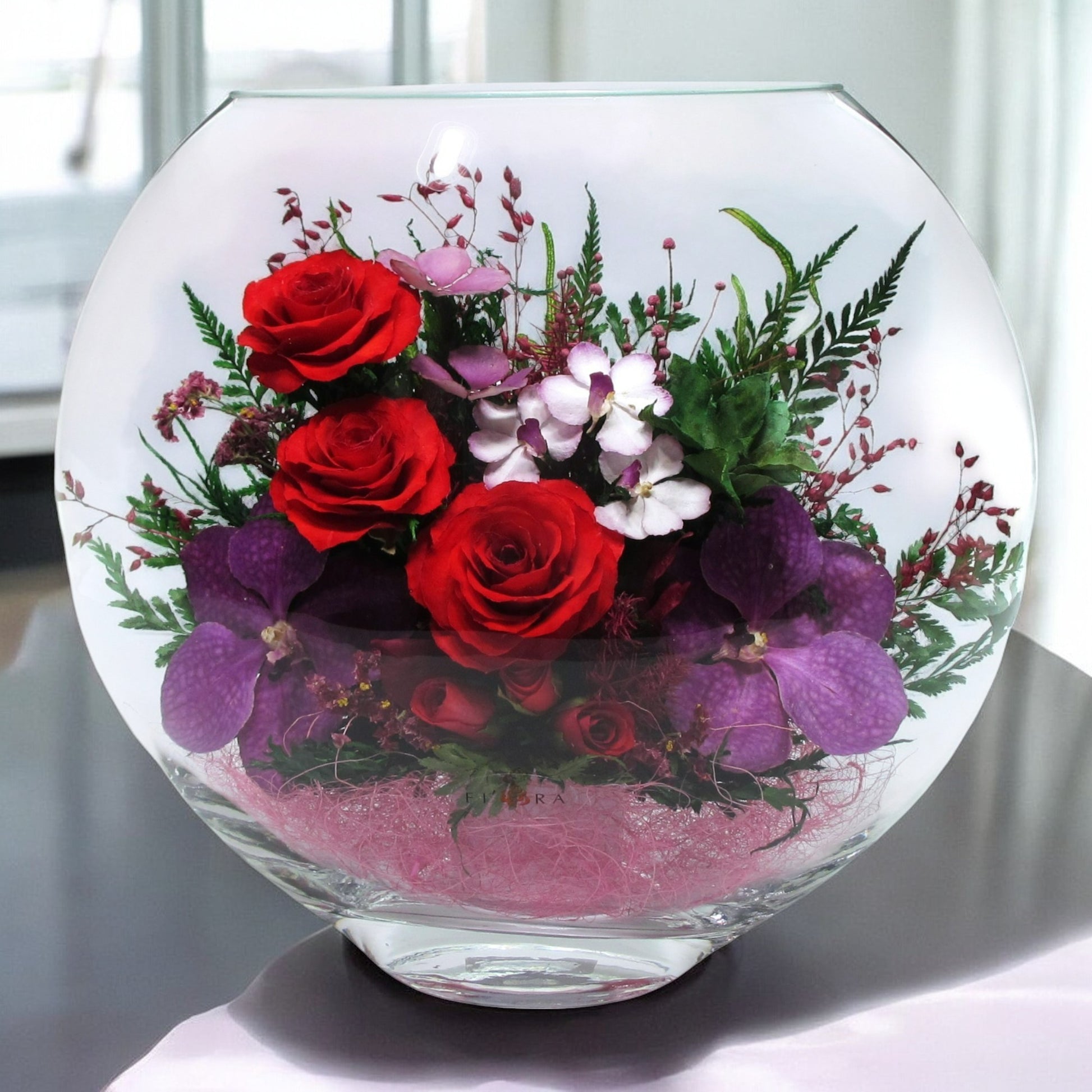 Each arrangement is meticulously handmade, and because the flowers are 100% natural, slight variations in color and size may occur. To extend their lifespan beyond 5 years, keep the arrangement away from direct sunlight and high humidity.