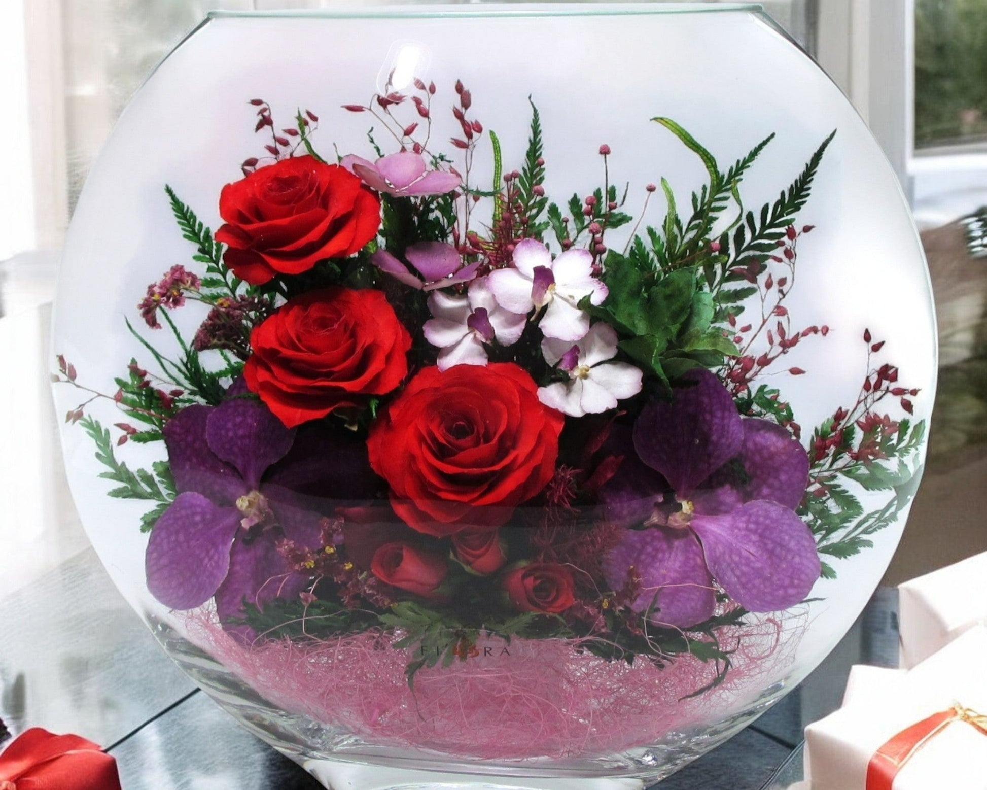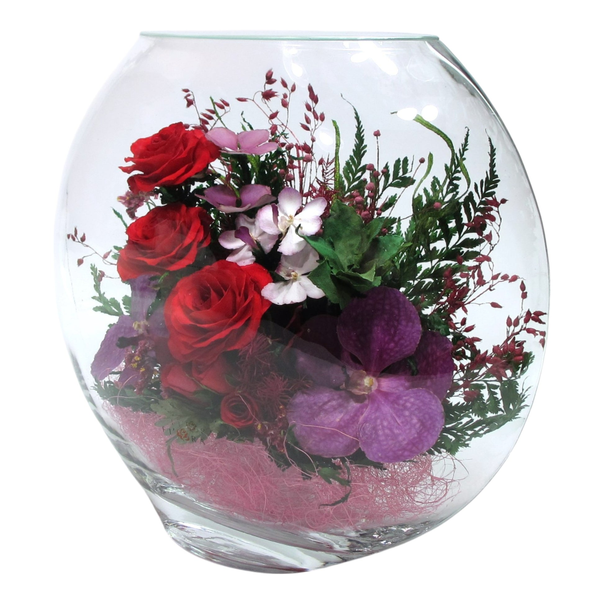 - 3 Red Roses, 2 Vanda Orchids, 3 Ascocentrum Orchids, 3 Rose Buds, and 2 Purple Periwinkles